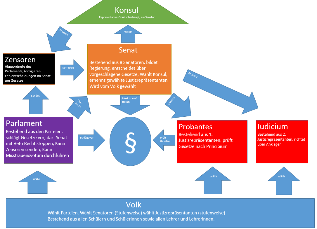 Die Verfassung der Demokratischen Volksrepublik Anno wurde von einem Team aus politikinteressierten Schülern erstellt und spiegelt eine Rätedemokratie wider. Der Konsul wird das repräsentative Oberhaupt des Staates sein, was heißt, dass er nicht mehr Macht als normale Senatoren hat. Diese wählen den Konsul, allerdings wurden die Wahlen der Senatoren und Richter aus organisatorischen Gründen auf Januar verschoben. Das Schule-als-Staat-Team hat auch eine Website auf der stetig neue Informationen gepostet werden, und unter anderem auch die Verfassung zu finden ist: www.schule-als-staat-anno.de